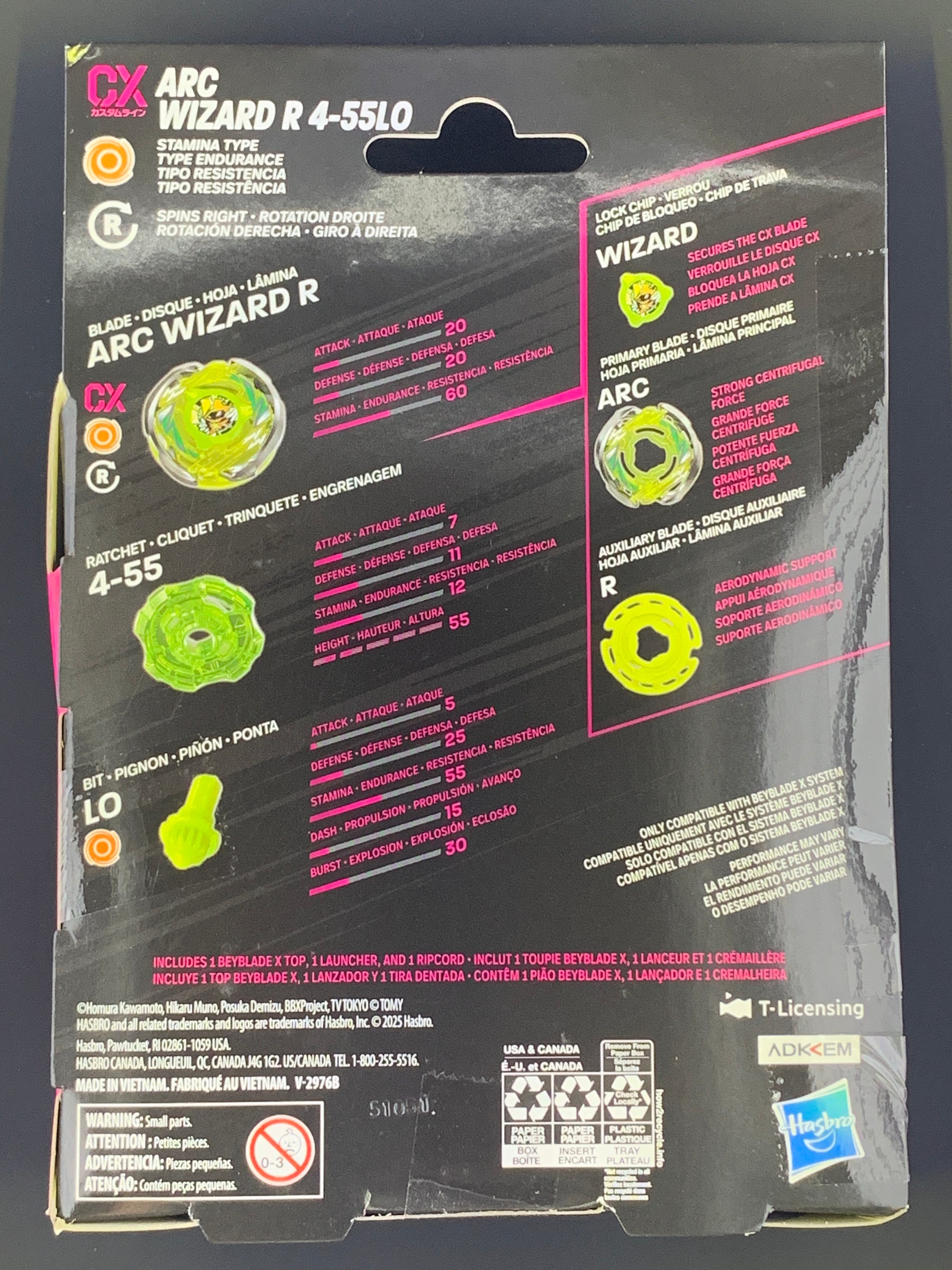 Arc Wizard R 4-55LO is a stamina type that does not live up the the "Wizard Rod" name of it's predecessor. It's shape has 2 main contact points that the assist blade "round" helps protect. Probably better on an attack set up. At the same time LO (Low Orb) is a solid stamina bit and currently is one of the best bits to stay low to the ground and avoid getting pocketed by the likes of Shark Scale and Hover Wyvern.
